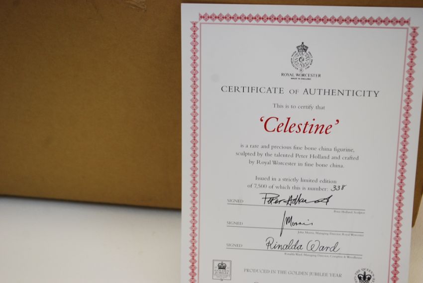 CELESTINE : A Royal Worcester figurine limited edition 358/7500 Boxed with certificate H27cm CW611 From an impressive and extensive private single owner collection of Royal Doulton and Coalport china figurines. Each figure is in perfect condition, complete within original boxes (presentation boxes where present), and each has its certificate present (unless specified). WORLDWIDE POSTAGE AND PACKING AVAILABLE ON ALL LOTS. Standard price to mainland UK -£15.99+VAT, Europe from £19.99+VAT - COMBINED SHIPPING AVAILABLE. Please view website for full details and overseas prices. Whilst every figure has been checked for condition by us and no faults have been found, buyers are reminded to satisfy themselves as to completeness / condition / accuracy of each lot prior to bidding, as per our terms and conditions. Viewing on all lots is welcome by prior appointment only.