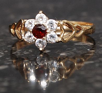 A 9ct gold hallmarked cluster ring set with CZ and central garnet within heart shaped shoulders. Weight 1.4. Size O. FREE UK POSTAGE ON ALL LOTS INCLUDING COMBINED PURCHASES ( ECONOMY UN-INSURED 2ND CLASS). 48HR TRACKED AND RECORDED SERVICE £6.99+VAT. OVERSEAS PLEASE VIEW WEBSITE FOR DETAILS
