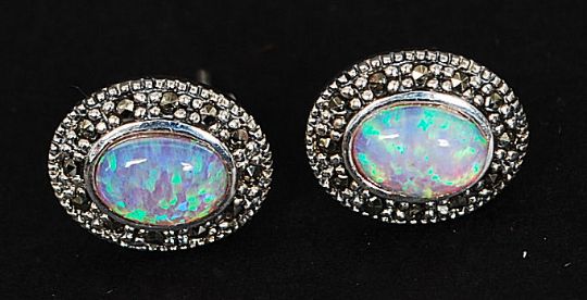 A pair of silver and opal earrings, the central opal stones being cabochon cut. 2.4g FREE UK POSTAGE ON ALL LOTS INCLUDING COMBINED PURCHASES ( ECONOMY UN-INSURED 2ND CLASS). 48HR TRACKED AND RECORDED SERVICE £6.99+VAT. OVERSEAS PLEASE VIEW WEBSITE FOR DETAILS