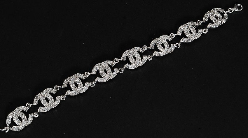 A silver chanel style bracelet, the bracelet with linked C construction. Total weight 22.4g FREE UK POSTAGE ON ALL LOTS INCLUDING COMBINED PURCHASES ( ECONOMY UN-INSURED 2ND CLASS). 48HR TRACKED AND RECORDED SERVICE £6.99+VAT. OVERSEAS PLEASE VIEW WEBSITE FOR DETAILS