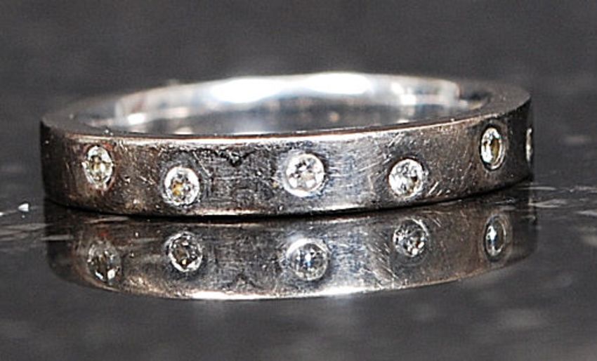 An 18ct white gold and diamond channel set eternity ring having inset 8 stones approx 8-10pnts total. Size H.5 3.9g FREE UK POSTAGE ON ALL LOTS INCLUDING COMBINED PURCHASES ( ECONOMY UN-INSURED 2ND CLASS). 48HR TRACKED AND RECORDED SERVICE £6.99+VAT. OVERSEAS PLEASE VIEW WEBSITE FOR DETAILS