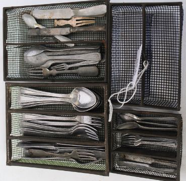 A collection of miniature dolls house cutlery in wirework cutlery trugs ( 4 in total )