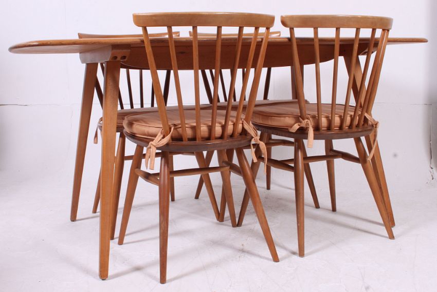 An Ercol blond beech and elm wood refectory dining table together with a set of 4 Ercol low stickback dining chairs being raised on tapered supports united by stretchers
