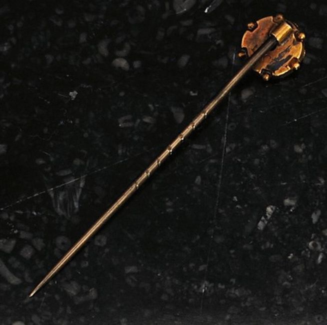 A 15ct gold vintage stick pin with inset sapphire to the flower head top. 1.1g