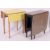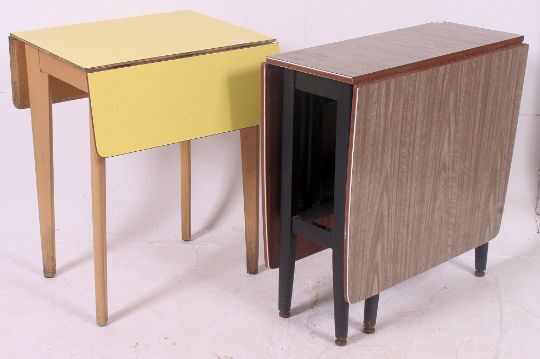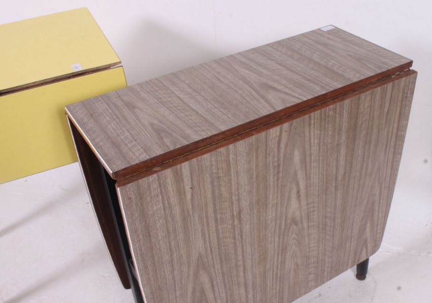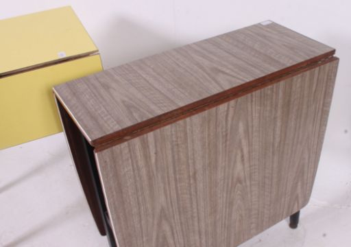 A 1950's retro yellow formica drop leaf dining table together with a formica faux wood gateleg dining table. H75 x W60 x D47cm