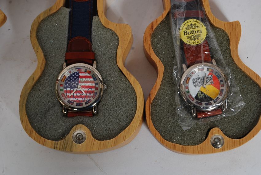 BEATLES WATCHES; A collection of 2x Limited Edition Apple Corps Beatles Watches. Each watch complete within the original cardboard box, and wooden guitar shaped engraved display box. With certificates. NOTE: From a large private collection of original Apple Corp Beatles commemorative watches. Each watch is sold as 'unworn' and 'unused' within the original boxes, with certificates (where present) and tags. All are generally is good condition, some may have display wear and tear. Each watch is different, showing a different scene or theme relating to The Beatles. A fabulous collection of music memorabilia watches. Buyers are still reminded to satisfy themselves as to condition of each lot prior to bidding, and these terms are general terms used to describe the entirety of the collection.