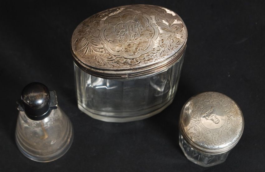 2 19th century silver top ladies dressing table jars. Both with Birmingham hallmarks together with a cayenne pepper pot.