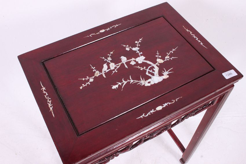 A Chinese mother of pearl inlaid side table with fret worked frieze, inlaid top raised on squared legs. H67 x W51 x D36cm