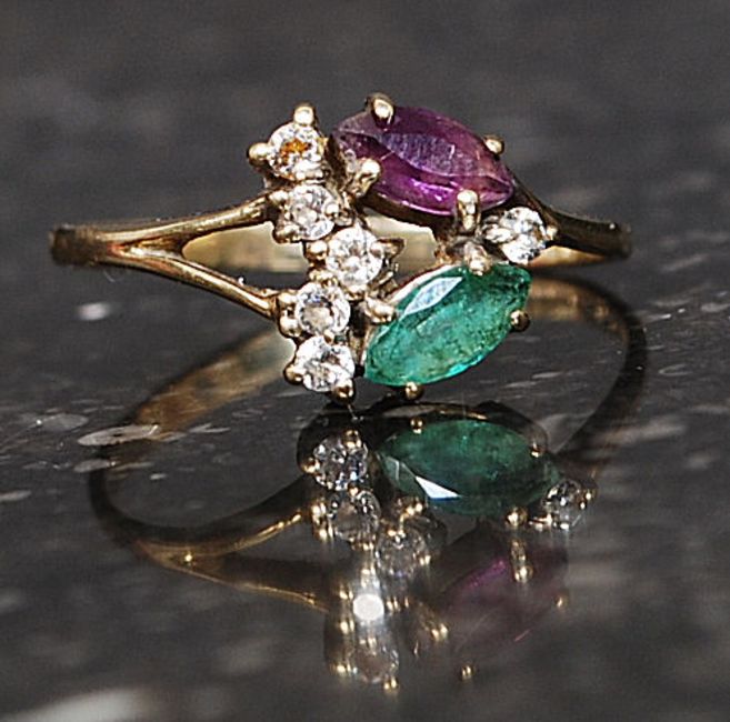 A 9ct gold hallmarked dress ring set with CZ green and purple gem stones in a floral spray. Weight 1.7g. Size P.5