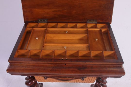 A good Victorian mahogany barleytwist workbox table. The hinged top enclosing a sectional appointed interior set over a pull out central wool bag and recesses. All raised on barley twist supports and cross stretchers with four carved legs and castors. Measures: 75 x 56 x 41