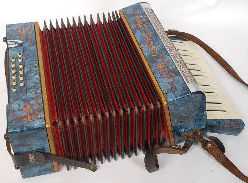 A vintage 1950's Pictro accordion complete in the original case. The instrument with good faux marble blue finish and decals