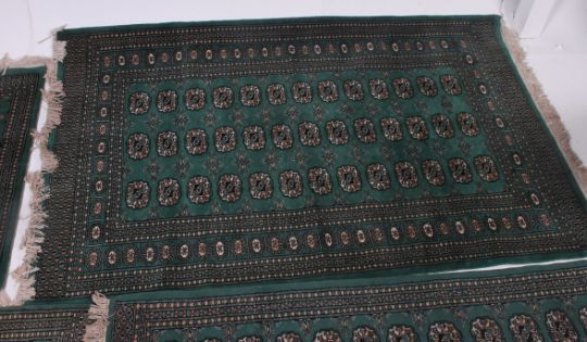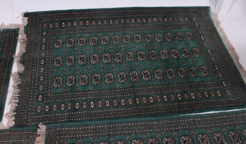 A collection of matching floor rugs / carpets of various sizes, having a rich green background with geometric design of Indian origin along with some other smaller rugs