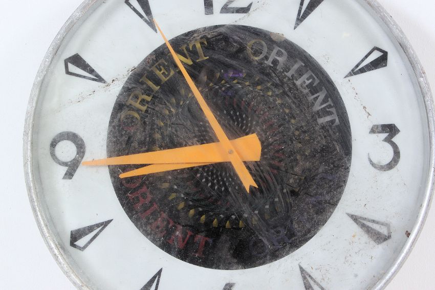 A retro mid century electric atomic Kaleidoscope large lighted pop art psychedelic Starburst motion wall advertising clock for Orient ( not Leyton Orient FC ). H51 degrees.