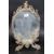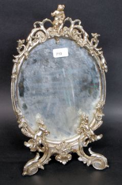 A decorative white metal barbola mirror dating to the mid 20th century. Rococo scroll worked oval frame on shaped legs with easel back, all adorned with cherubs. H45 cm