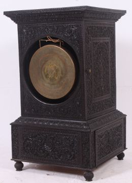 A late 19th century Anglo - Colonial Burmese carved pedestal gong cabinet. The pedestal of fret carved details all over with brass circular gong to one side. One side with drawer to the plinth with cabinet locker door above. Similar Burmese furnishings all from the same vendors family to include a jardiniere, side table and tripod table. H94 x W54 x D54cm