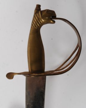 A 20th century vintage Indian hanging decorative sword, with decorated brass handle in the shape of a lion, with original sheath.