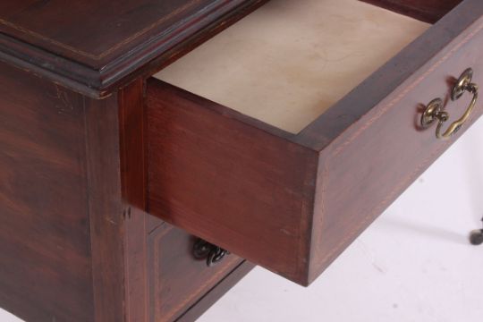 aN Edwardian mahogany dressing table with inlay. The dressing table raised with two long and two short drawers on tapering supports having swing mirror atop.