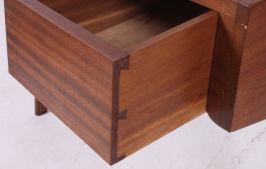 A stunning 1960's Danish teak writing table desk. Of angular form raised on tapered supports. The angular desk front with blind drawers. Above a plain writing surface with deep stationary recess to the rear.H76 x W107 x D73cm