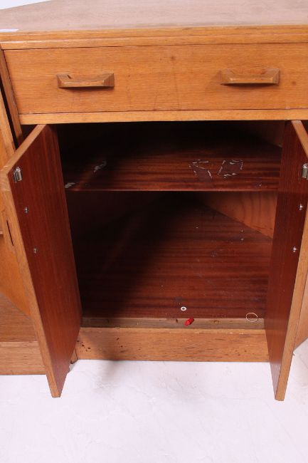 A rero vintage G-plan oak corner secretaire desk cabinet together with another angular G-plan corner cabinet, a tapering light oak G-Plan corner bookcase and a light oak G-Plan oak sliding glass bookcase cabinet. H85 x W99 x D65cm