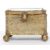 A beautiful miniature gilt metal and bevelled glass jewellery casket. Raised on ball finials with rococo scroll work body, bevelled glass hinged top with buttoned lined silk interior. H4 cm