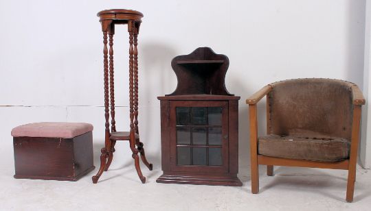 A collection of furniture to include fireside chair, torchere, vintage shoe shine box, folding trolley etc