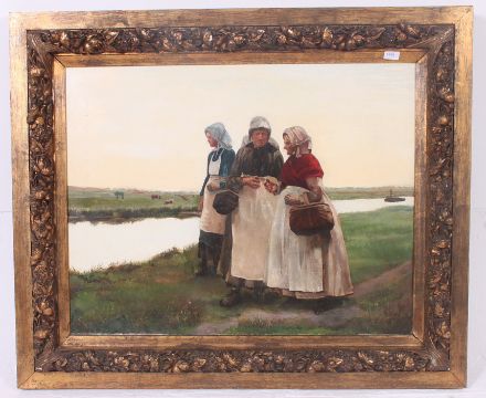 J Catois ( 1800 - ) ' Beside The Canal ' A large imposing oil on canvas painting of women beside a canal. Signed to the lower corner, possibly Jenia Catois. Set within large gilt oak frame. Possibly a dutch study, Catois born in the Dordogne, France is known for portrait studies - peasant scenes. H70 x W90cm