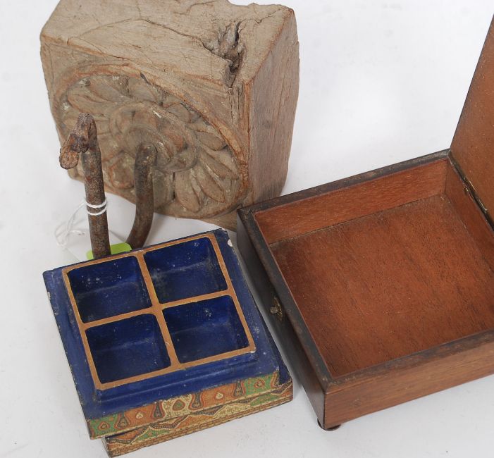 An Austrian secessionist rosewood and brass inlaid box having decorative top. Together with a Kashmeri laquered square box and a colonial carved wood and iron hook