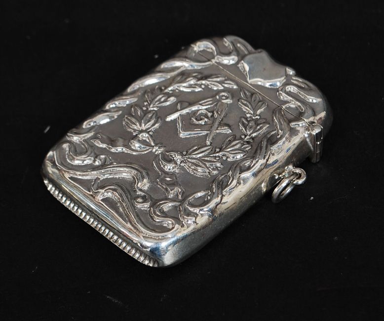 A 925 stamped silver metal match vesta having a hinged lid, Masonic symbols to the front and rear with a strike to the base H6.5cm 42g