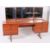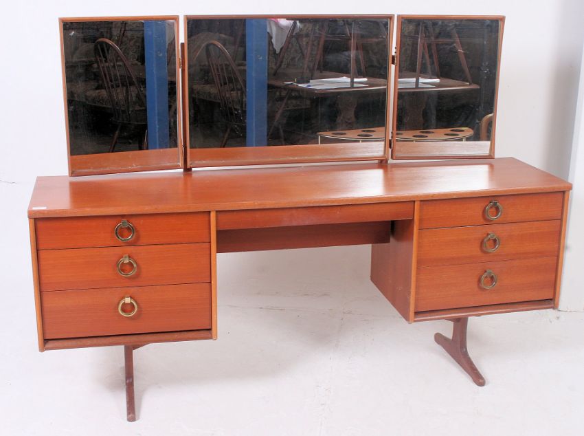A retro 1970's teak pedestal dressing table by Austinsuite having triptych mirror, a central drawer flanked by two banks of three. H125 xW169 x D42cm