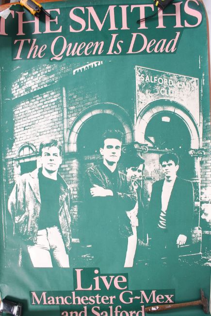 THE SMITHS - An extremely large promo poster for THE SMITHS ' THE QUEEN IS DEAD ' live tour at the Manchester G-Mex Salford. The iconic picture of the band taken under The Salford Lads Club, 154 cm x 102 cm. Poster rolled, pin holes and blue tack to rear.