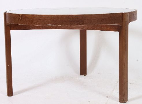 A retro Danish style teak round glass topped coffee table with shaped supports. H51 x W82cm