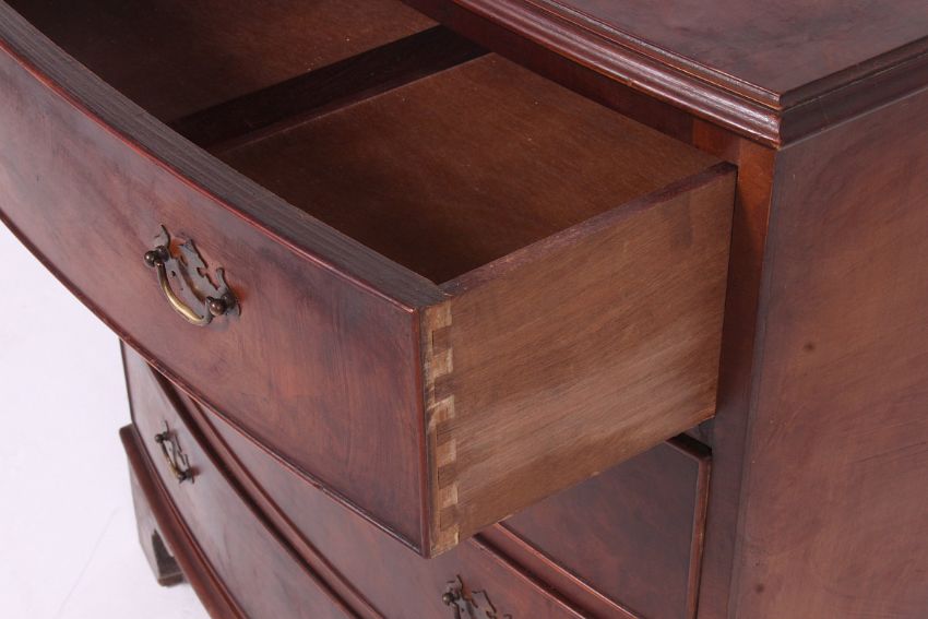 A god 20th century Georgian style mahogany bachelors bow front chest of drawers raised on bracket feet. H84 x W76 x D49cm
