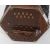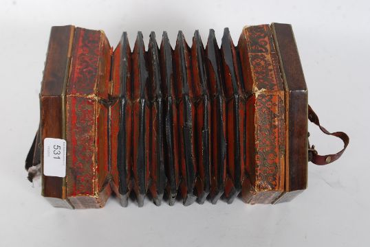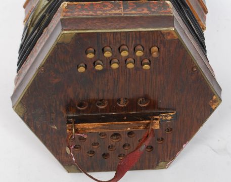 A vintage wooden squeeze box accordion instrument with central bellows and push buttons to both sides.