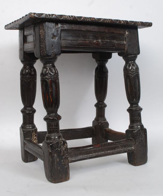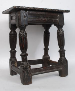 An early English Elizabethan oak joint stool believed, circa 1600. The stool of peg joint construction having fluted cup and cover legs united by simple reeded stretchers, all on block feet. Above a simple frieze having gadrooned carved later panelled oak seat. Measures: 51 x 45 x 29.