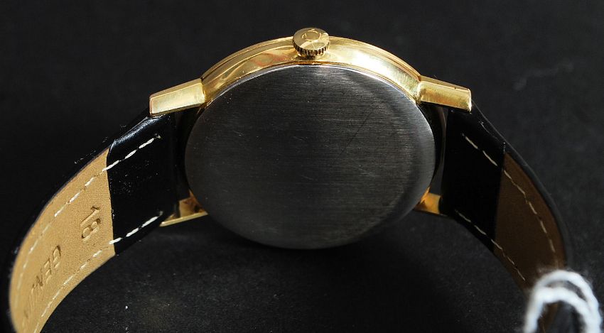 A gentlemans vintage early 1970's Omega Geneve wristwatch. The champagne dial with gilt baton numerals and faceted hands with date aperture. Set within gold plated case with stainless steel back set on a later leather strap but with original Omega buckle. Case No 131.0019 - Cal.613. Serial No 31700789.
