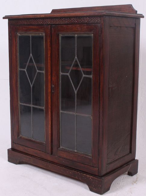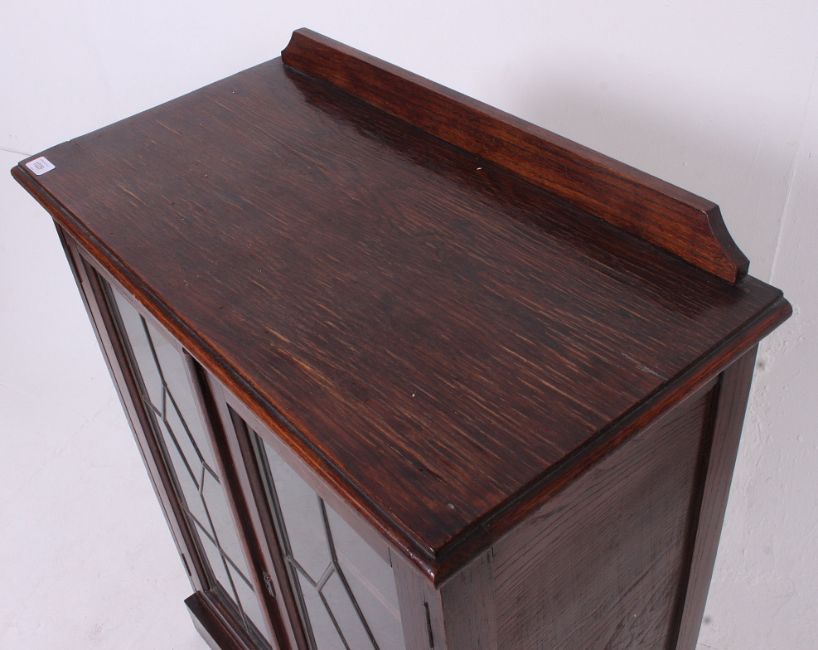 A good quality 1920's oak leaded glass display cabinet having twin doors with shelved interior set within. H93 x W71 x D36cm