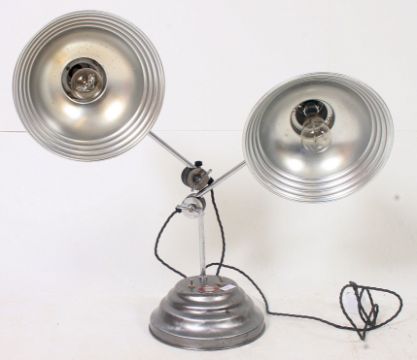 A vintage 1950's Twin head anglepoise adjust Perihel desk table lamp of Industrial proportions. The stunning lamp with terraced base having twin flicker switches. Above twin stems with large polished metal shades. Makers plaques to centre. Rewired and Pat tested.
