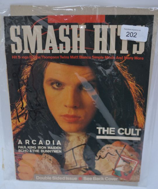 THE CULT; An original autographed ' Smash Hits ' magazine cover, being signed by members Ian & Jamie. UK, European & Worldwide packaging available on all lots. Please see website www.eastbristol.co.uk for all details. Combined shipping available on all lots where possible.