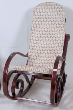 A pair of Thonet style bentwood rocking chairs having tapestry upholstered cushions, all in the manner of Thonet