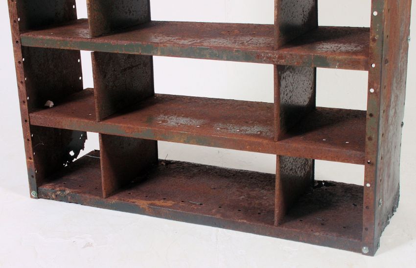 A vintage industrial floor standing metal workshop pigeon hole cabinet. H190 x W92 x D30cm