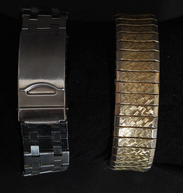 An Omega Seamaster quartz movement wristwatch having silvered dial with baton numerals and date aperture. Set in stainless case and bracelet. Together with an Omega quartz round faced wristwatch being gold plated. The face with baton numerals and date aperture with notation for Inland Steel. Both housing a Cal.1342