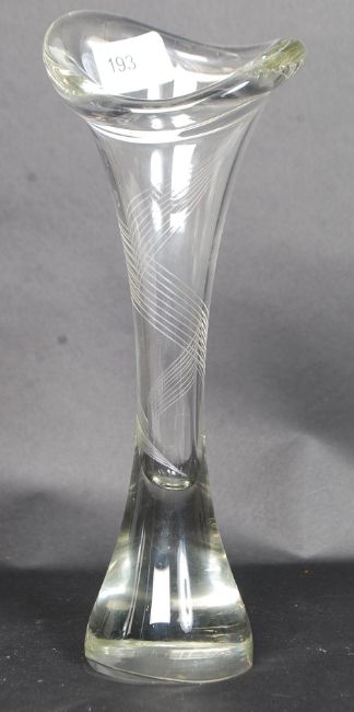 A retro 20th century Humppila Finland freeform studio glass vase with cut and frosted spiral design. Signed by Mikko Helander to bottom. Also marked Humppila to bottom. 17cms high