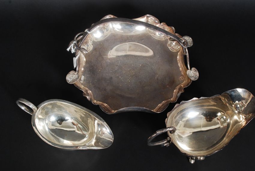 A good early 20th century silver plated centre / bon bon dish having scalloped edges with leaf finials together with a silver plated creamer raised on hoof feet along with another creamer. Weight: 834g.