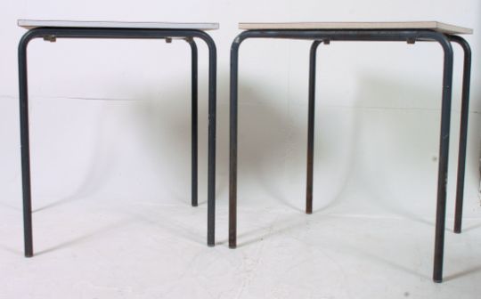 A pair of retro industrial school tables having a melamine top raised above metal tubular legs. H73 x W61 x D61cm