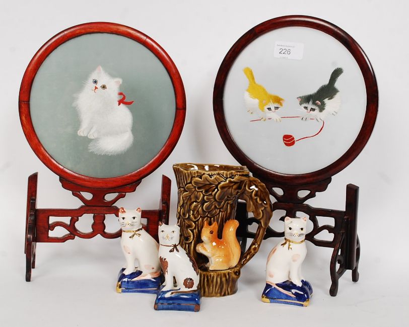 2 Chinese wooden table top discretion screens with silk panels of cats along with cat ceramic figures x 3 and a Hornsea figurine