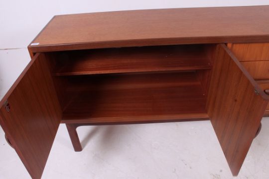 An excellent retro 1970's solid teak wood G-Plan retro vintage sideboard. Raised on squared legs with a series of cupboard having central bank of drawers. ( exceptionally heavy construction ) Matching dining table in lot. H80 x W206 x D46cm