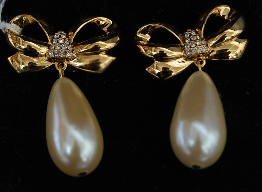 A pair of vintage yellow metal Elizabeth Taylor ' white diamonds ' drop earrings of ribbon form with pave set diamonte centres having large faux pearl drops. FREE UK POSTAGE ON ALL LOTS INCLUDING COMBINED PURCHASES ( ECONOMY UN-INSURED 2ND CLASS). 48HR TRACKED AND RECORDED SERVICE £6.99+VAT. OVERSEAS PLEASE VIEW WEBSITE FOR DETAILS