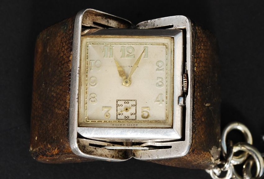A 1930's Art Deco Sportank silver and snakeskin purse watch complete with white metal albert fob chain. The rear of the watch marked 925. Weight: 98g GW. FREE UK POSTAGE ON ALL LOTS INCLUDING COMBINED PURCHASES ( ECONOMY UN-INSURED 2ND CLASS). 48HR TRACKED AND RECORDED SERVICE £6.99+VAT. OVERSEAS PLEASE VIEW WEBSITE FOR DETAILS