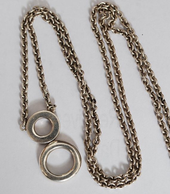 A stunning large contemporary Mappin & Webb silver 925 necklace and twin hoop pendant. Total weight 21.5g FREE UK POSTAGE ON ALL LOTS INCLUDING COMBINED PURCHASES ( ECONOMY UN-INSURED 2ND CLASS). 48HR TRACKED AND RECORDED SERVICE £6.99+VAT. OVERSEAS PLEASE VIEW WEBSITE FOR DETAILS
