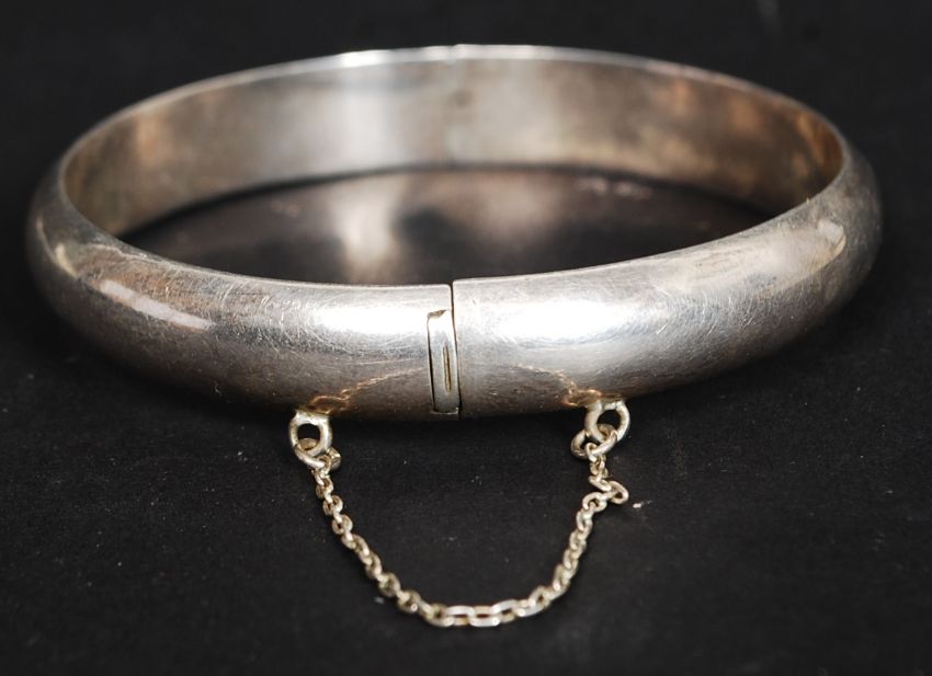 A traditional silver bracelet of hoop form with safety clasp. Stamped 925. Total weight 15g FREE UK POSTAGE ON ALL LOTS INCLUDING COMBINED PURCHASES ( ECONOMY UN-INSURED 2ND CLASS). 48HR TRACKED AND RECORDED SERVICE £6.99+VAT. OVERSEAS PLEASE VIEW WEBSITE FOR DETAILS